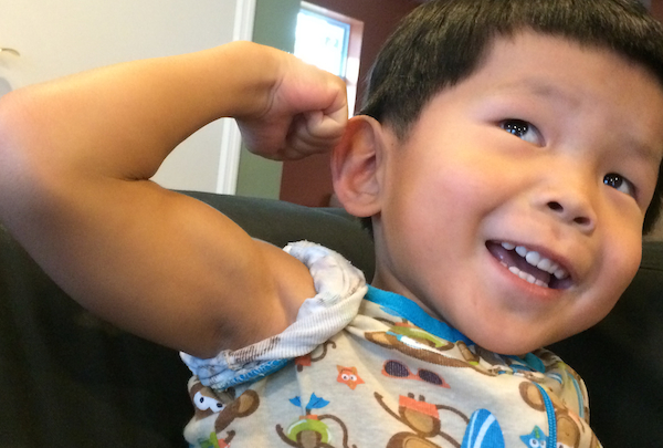 There are a few medical updates. Some of you know that Jaden was scheduled for another spine surgery in August. Unfortunately, that has been rescheduled now for November 6. We’ll post updates here as that gets closer. He has grown and is doing so well after his traumatic year last year. He has continued building up the strength in his arms and trunk, which will help him go far as he works around his lower-limb paralysis. Check out those biceps! 🙂 And be jealous.