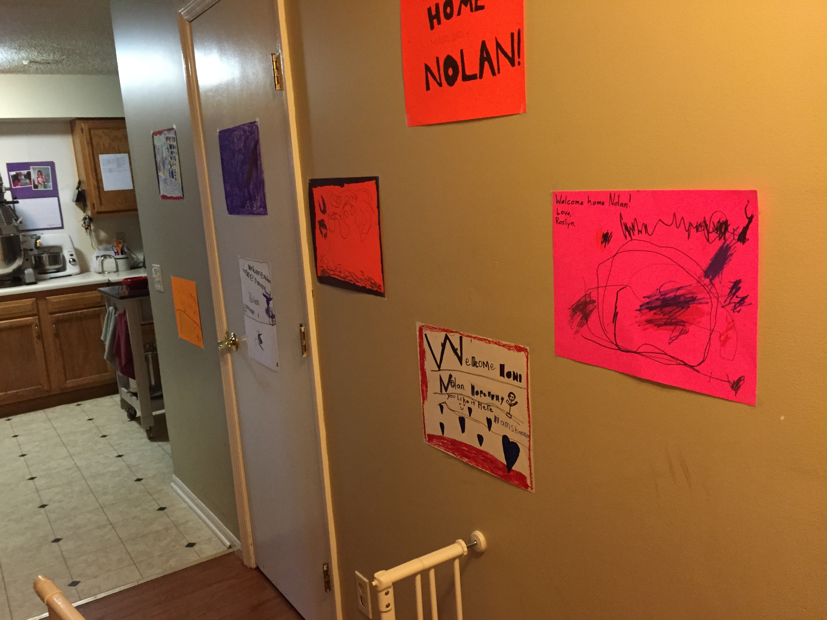 It was already past the kids’ bedtimes when we arrived home, so we didn’t really know what to expect, especially after the long day that Nolan had already had, but we phoned ahead and told the older kids to keep the little ones up to wait for us. We explained to Nolan that he needed to use a calm, soft voice around Kathryn because sometimes sudden loud noise can upset her. He had already asked many questions about her brain damage, and shown such tender concern for her in all of our conversations. He seemed to process this immediately. As we drove up to our house, he was so excited about the balloons we always put on our porch to welcome home a new little one. And he loved the sign on the front door. Inside, he was awed by the many other hand-drawn pictures hanging on the wall in the entryway for him.