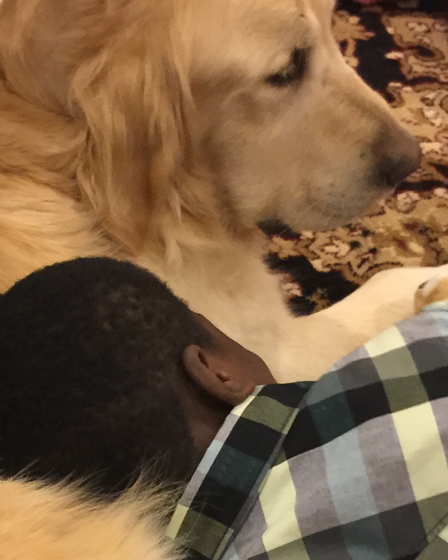 We had warned him that Murray would welcome him . . . ahem . . . . exuberantly. So he was prepared for the huge white fluff ball that came barreling toward us. Although he loved Murray right away, he was a little scared of so much energy. Once we got Murray calmed down, Saxon approached Nolan calmly and lovingly, and Nolan was smitten. The two of them bonded on the spot, and he’s no longer afraid of Murray.