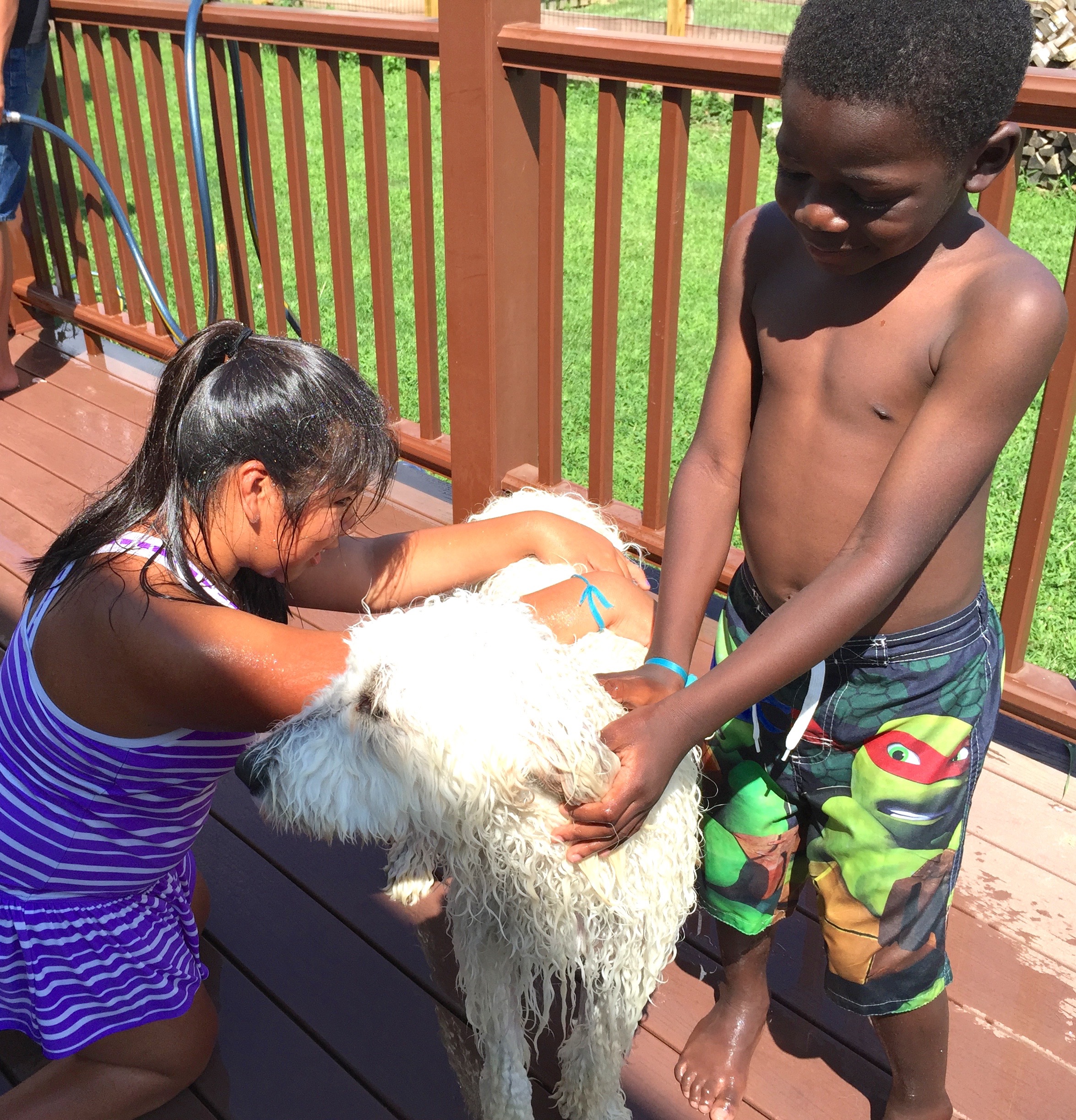 Nolan helping his sister, Kathryn, bathe our dog, Murray. He thought the idea of bathing dogs was hilarious.
