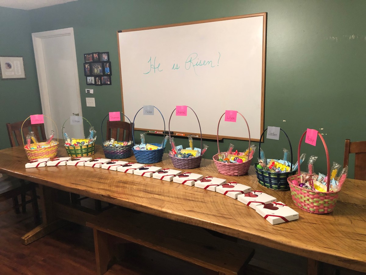 Once ALL of the kids were in bed, Scott and I got the table ready for morning. This included boxes of very special chocolate for our awesome older kids, along with the baskets for the eight youngest